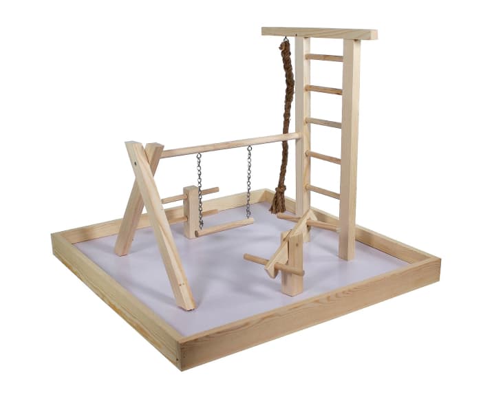 Your bird will sing with delight while she enjoys her spacious Bird Life Penn-Plax Bird Life Wooden Playpen for Birds! This fun-filled, wooden playpen is packed with features. It includes a six-step ladder, a play swing, two perches and a laminated base.